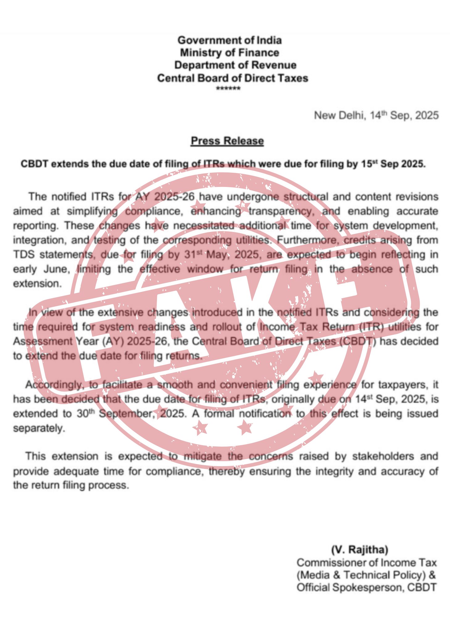 Income Tax Department Clarifies: No Further Extension in ITR Filing Due Date Beyond September 15, 2025 A fake news post