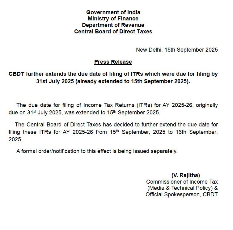 CBDT Extends ITR Filing Due Date for AY 2025-26 Till September 16 The Central Board of Direct Taxes (CBDT) has