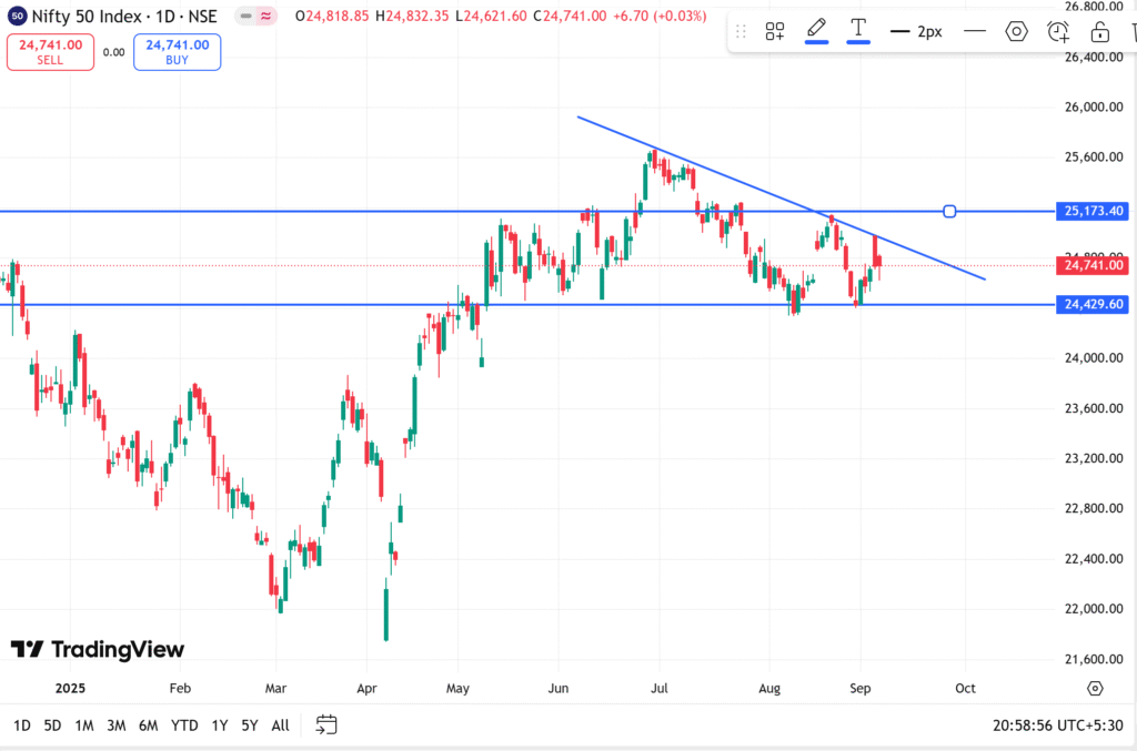 - Nifty 50 closed the week at 24,741, consolidating within the 24,500–25,000 band.